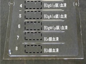 (2)切り取った下部5レーンを、ゲルフィルムを下にして実験台の上に置く。